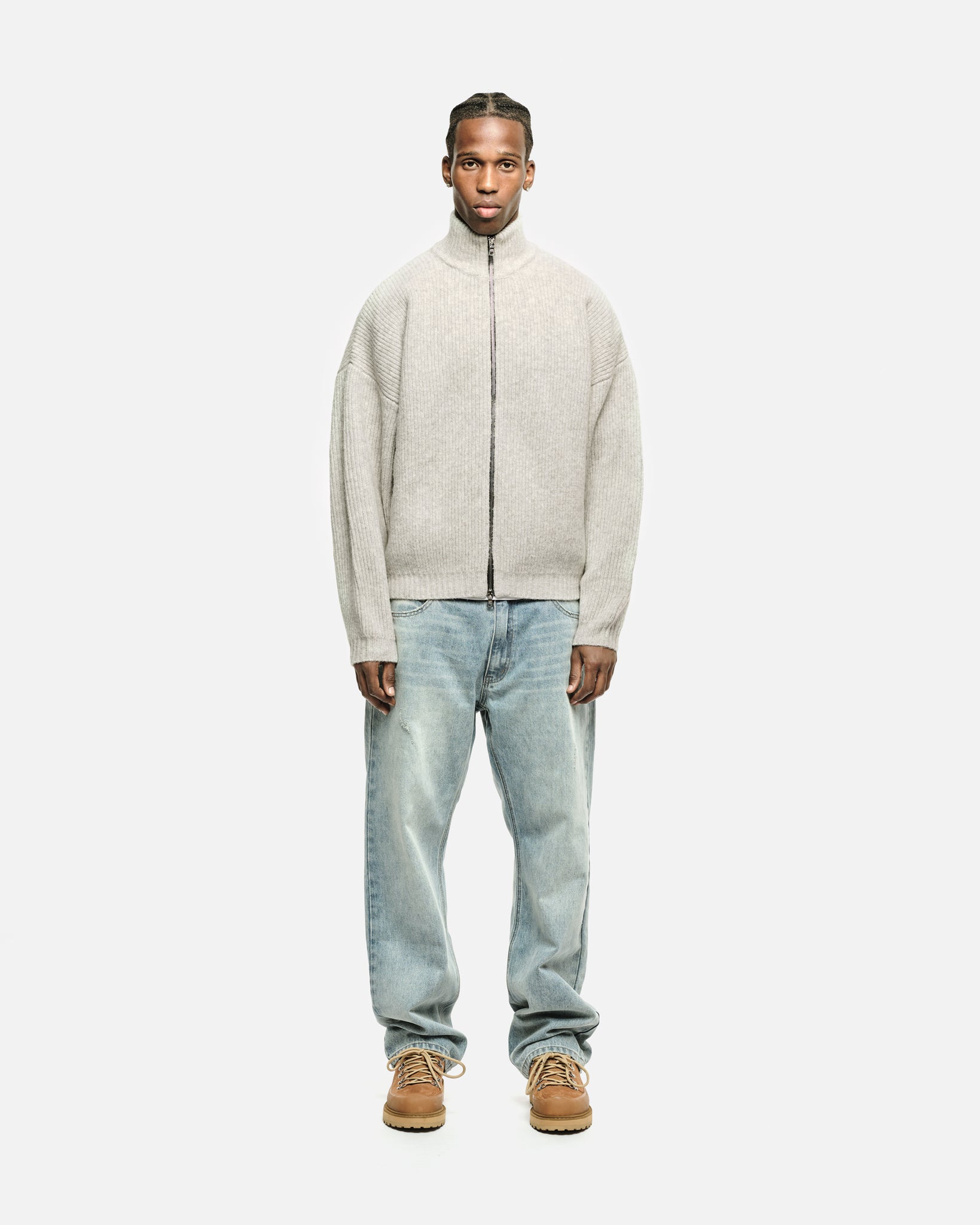 A chunky knit track top in a rib knit construction.  Super soft brushed yarn to create a slight vintage look to the outer.  Cut boxy and cropped making it perfect for layering or just keeping warm in the winter months.